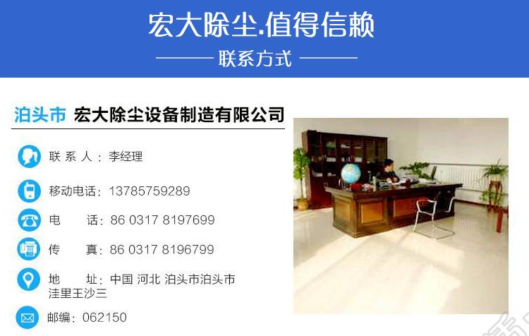 公司名稱:泊頭市宏大除塵設備制造有限公司 公司地址:泊頭市開發(fā)區(qū)環(huán)城東路南首1號 電話:0317-8392799 8162866 傳真:0317-8392977 手機:18931764475 網(wǎng)址: